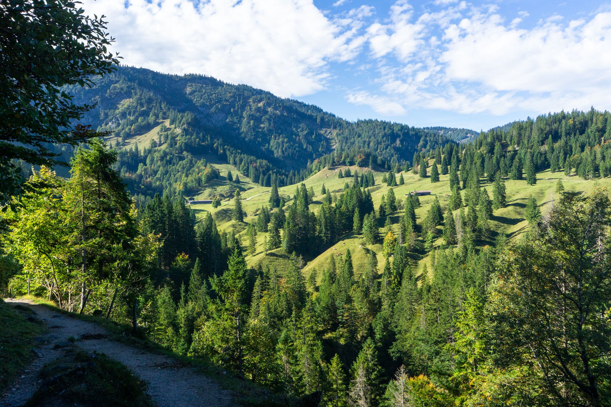 Wer Fernblick sucht, muss noch einmal eineinhalb weitere Stunden für 500 Höhenmeter Aufstieg auf den Schildenstein investieren. Dort wird man dann aber auch mit einem Rundum-Panoramablick auf die Alpengipfel belohnt.