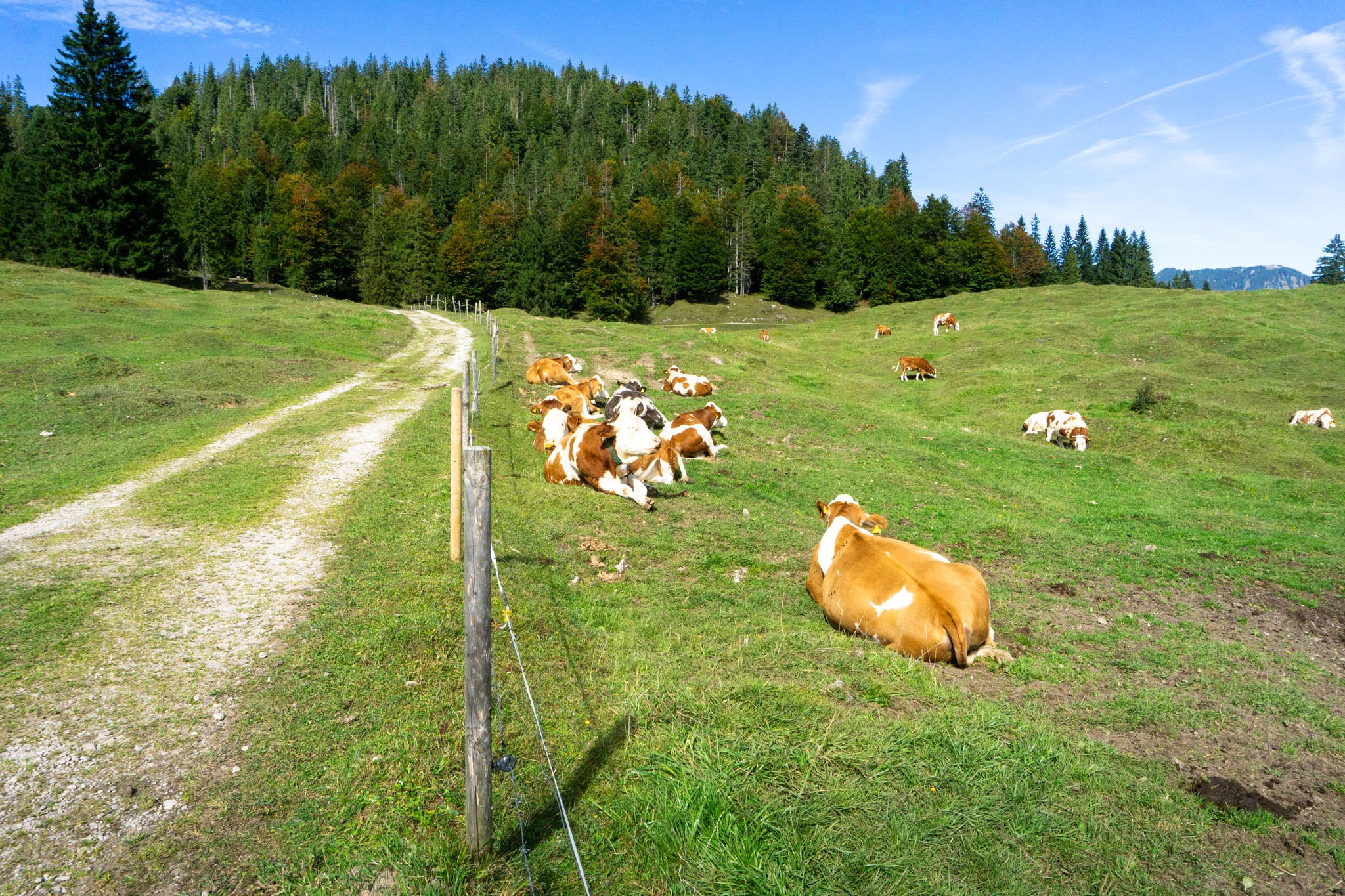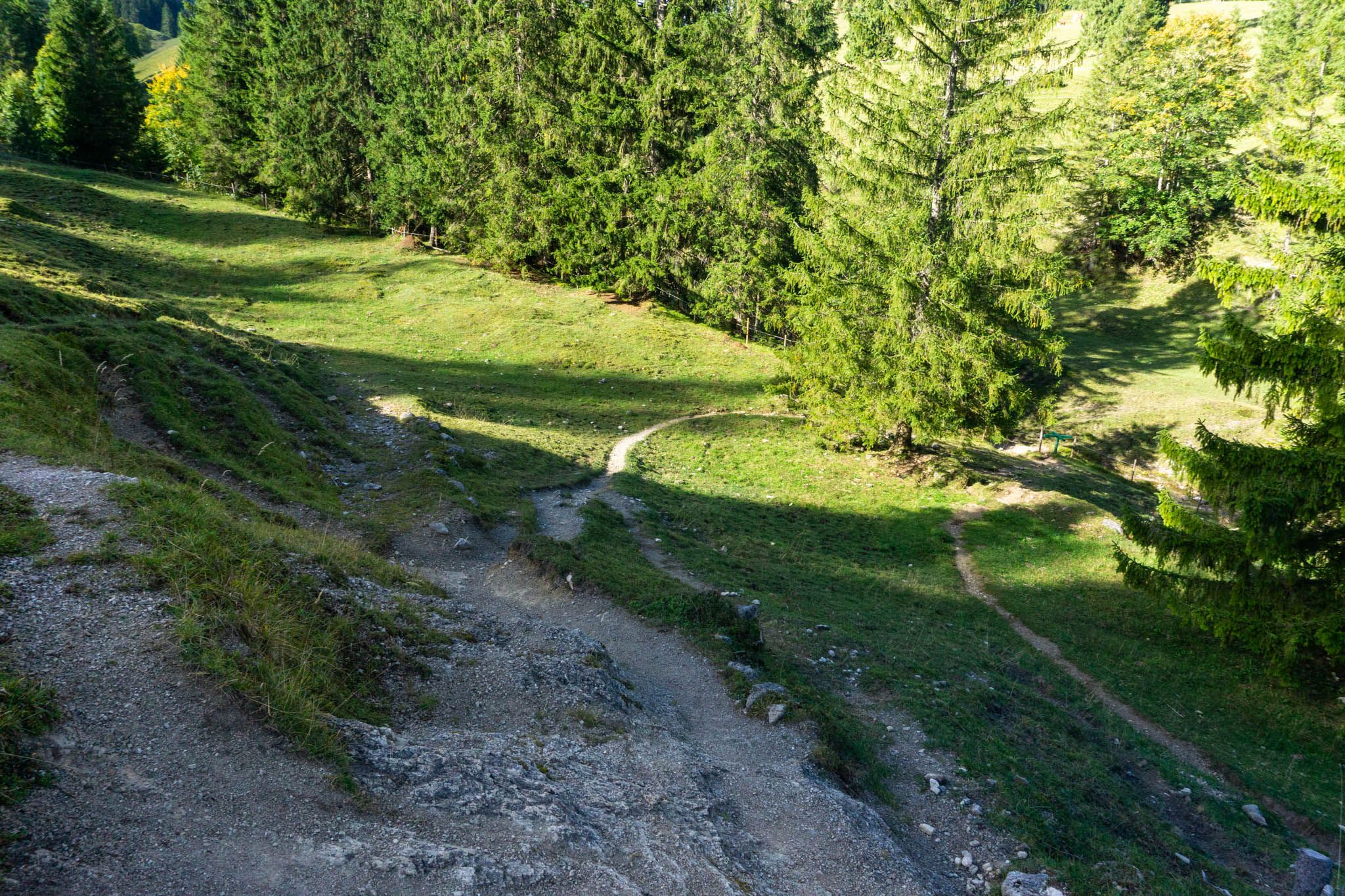 Wir lassen das heute, sondern machen uns auf den Abstieg. Der erfolgt weitgehend über den breiten Fahrweg. Nur ganz zu Beginn, nach knapp hundert Metern, können wir etwas abkürzen und den Weg über die Almwiesen nehmen.