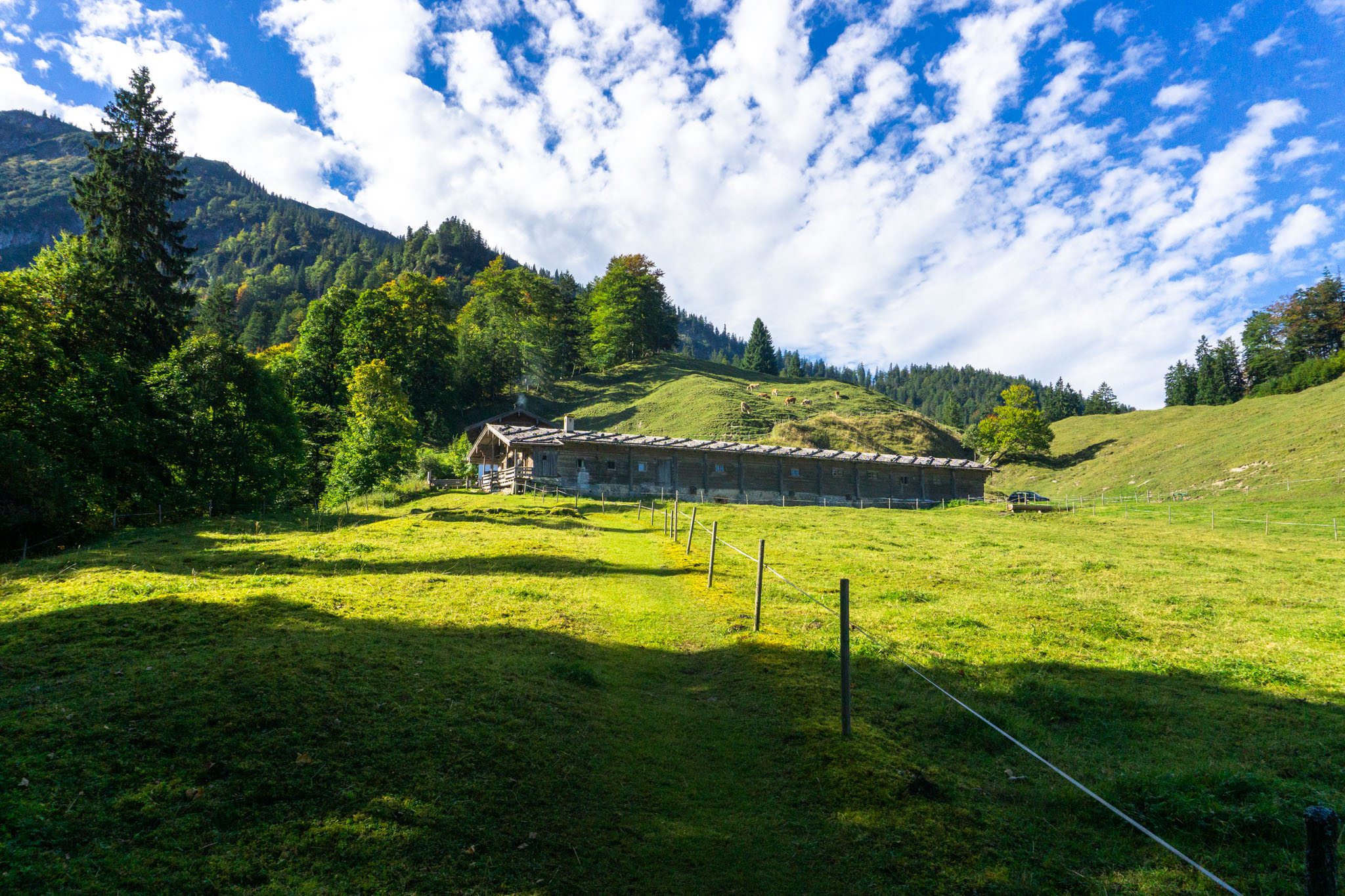 Die Wiesen rund um die Alm bieten aber genug Möglichkeiten, den Blick auf Roß- und Buchstein zu genießen. Der ist von hier oben besonders gut.