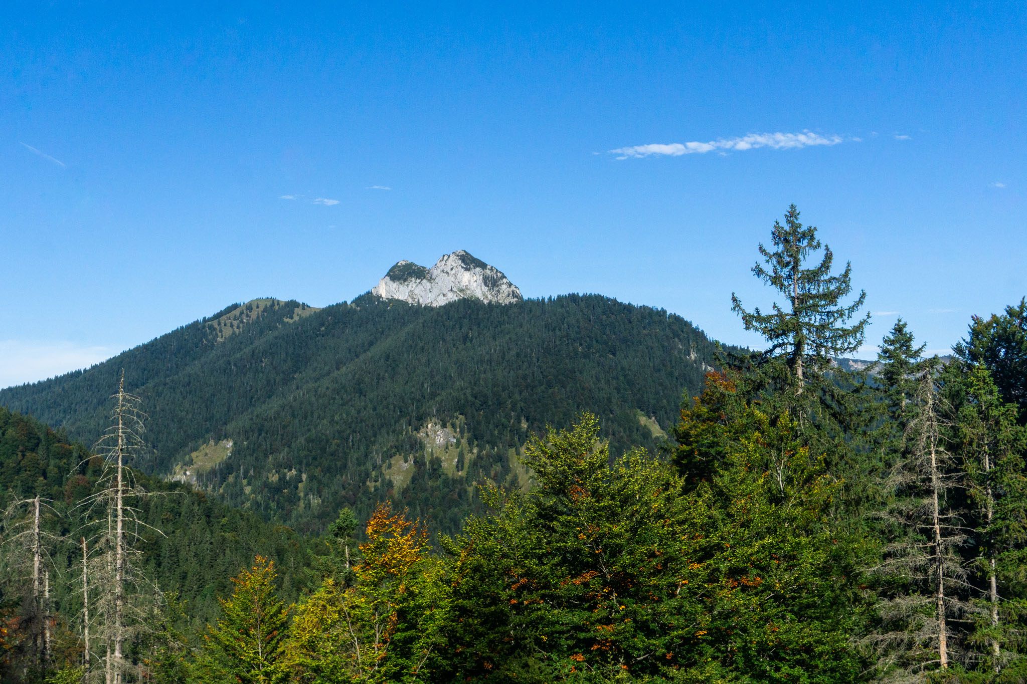 Viele Ausblicke gibt es nicht, aber ab und zu sehen wir die felsigen Gipfel von Roß- und Buchstein aus dem Wald ragen.