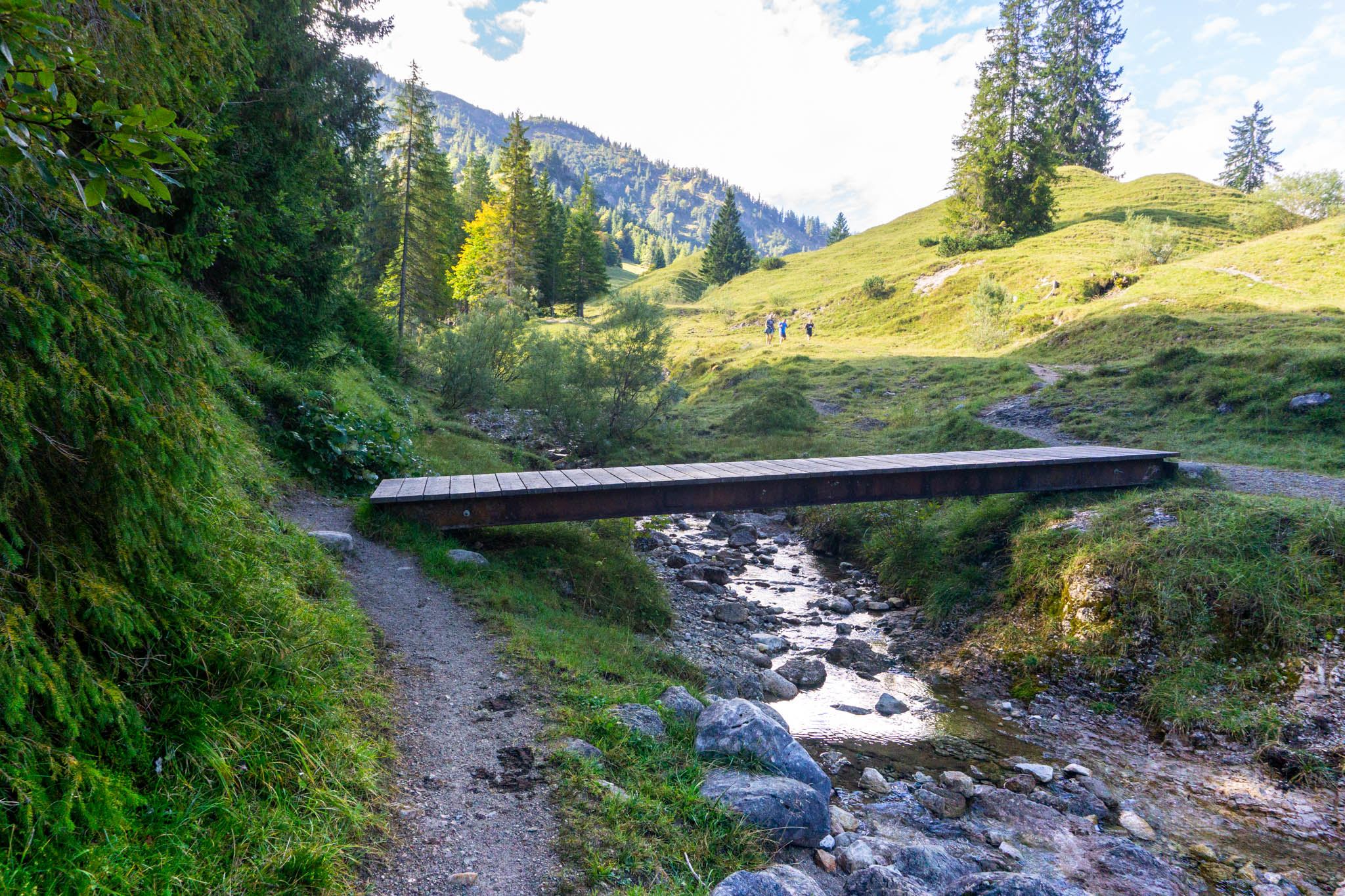 Über eine kleine Brücke und eine Ecke, dann sind wir auch schon fast da. Der Weg führt uns auf gleicher Höhe in einem Winkel auf die Geißalm zu.