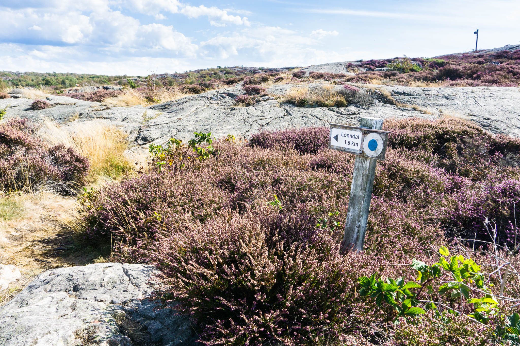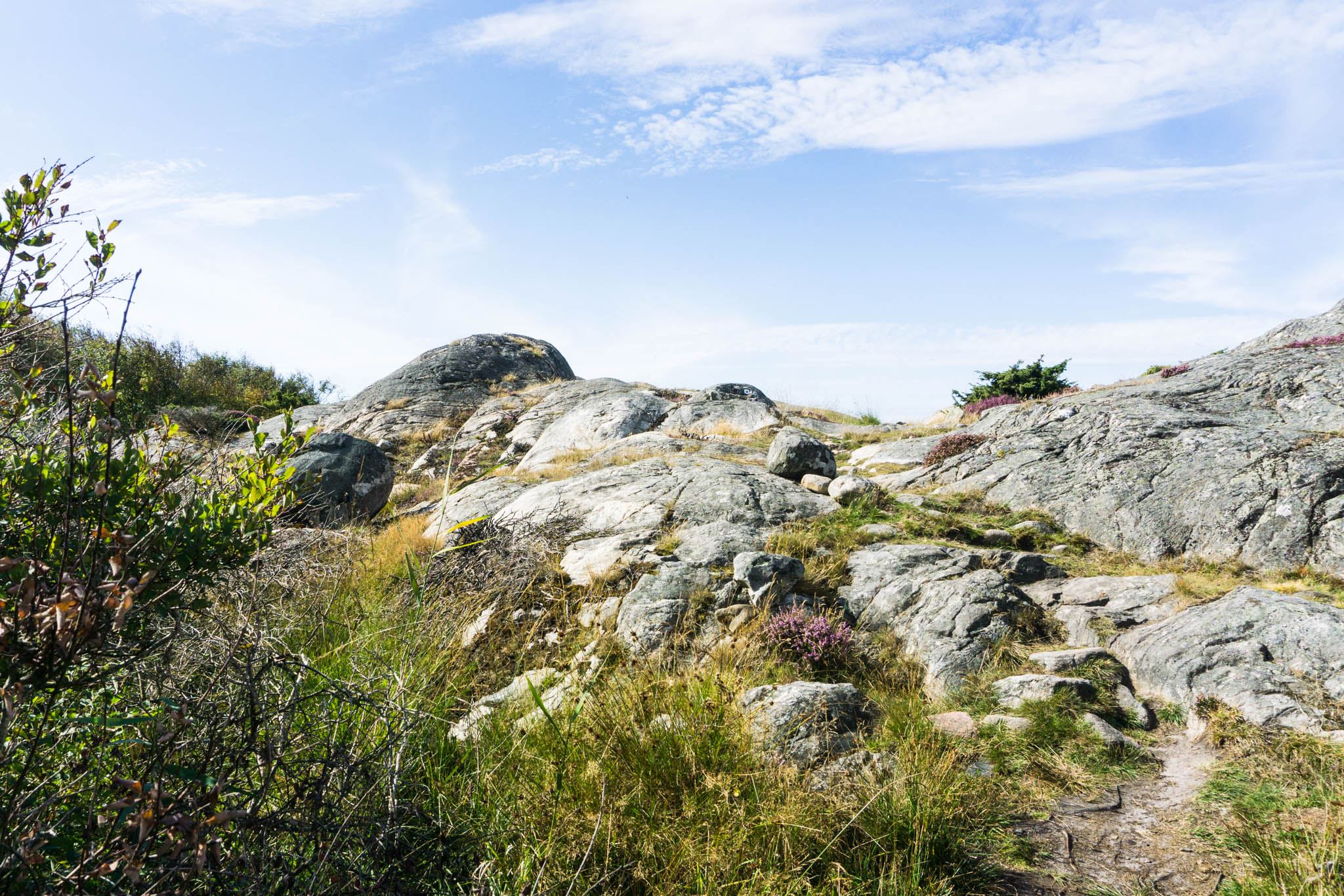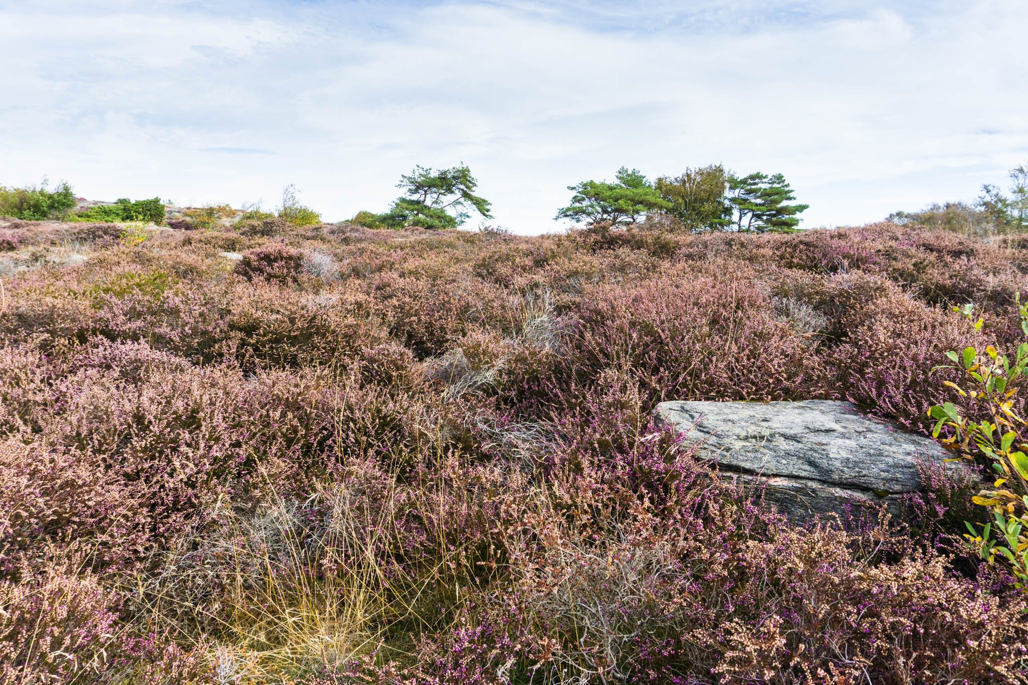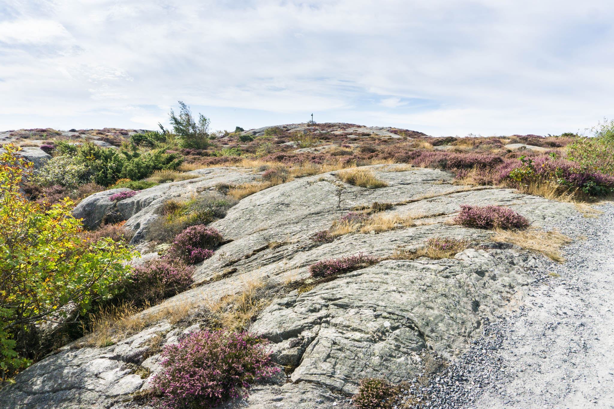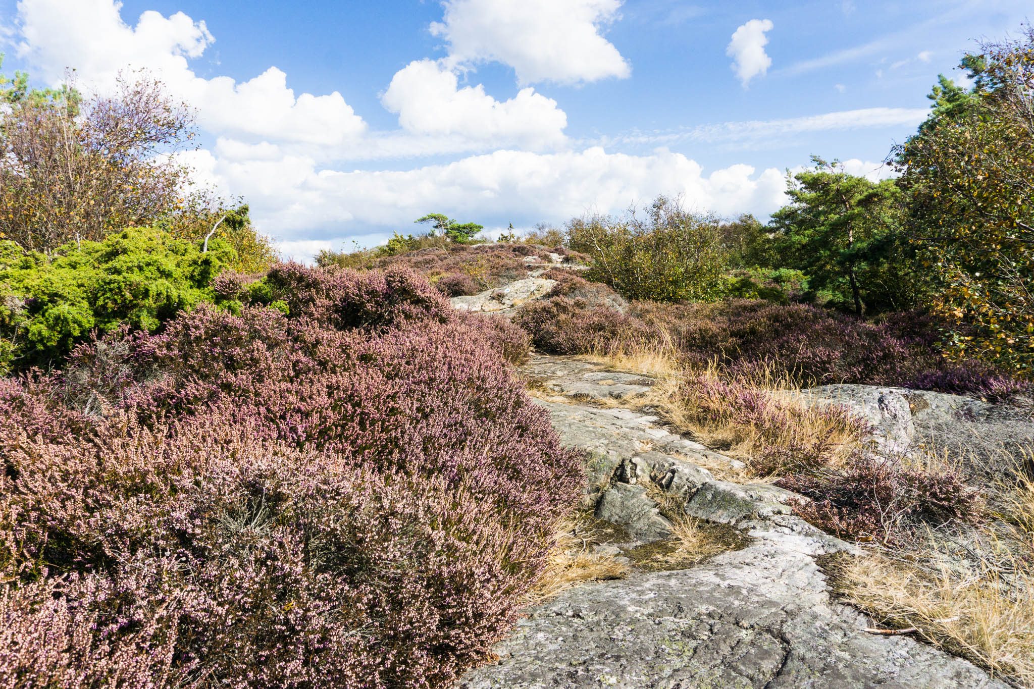Auf dem breiten Weg wandern wir ein paar Minuten lang durch den lichten Wald, in dem überwiegend Birken wachsen. Kurz nachdem wir eine Kreuzung und ein paar Häuser passiert haben, endet der Wald und wir wandern durch eine Heidelandschaft mit großen Erikafeldern, kleineren Büschen und Gräsern. Dazwischen liegen die vom Gletscher der Eiszeit glattgeschliffenen Felsen.