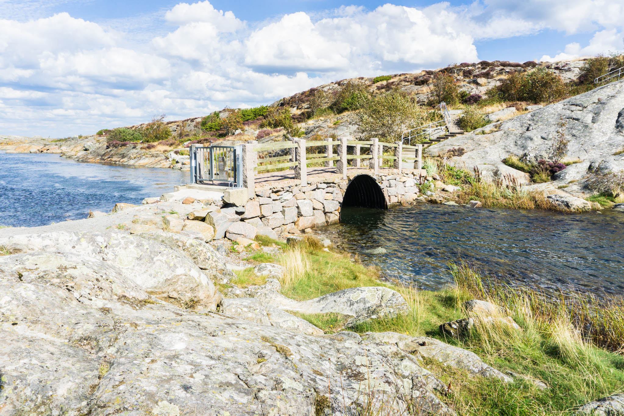 Eine hier nur wenige Meter breite Meerenge, die die Inseln Brännö und Galterö trennt. Etwas unterhalb des Weges sehen wir nun eine kleine Steinbrücke, die über den Sund führt.