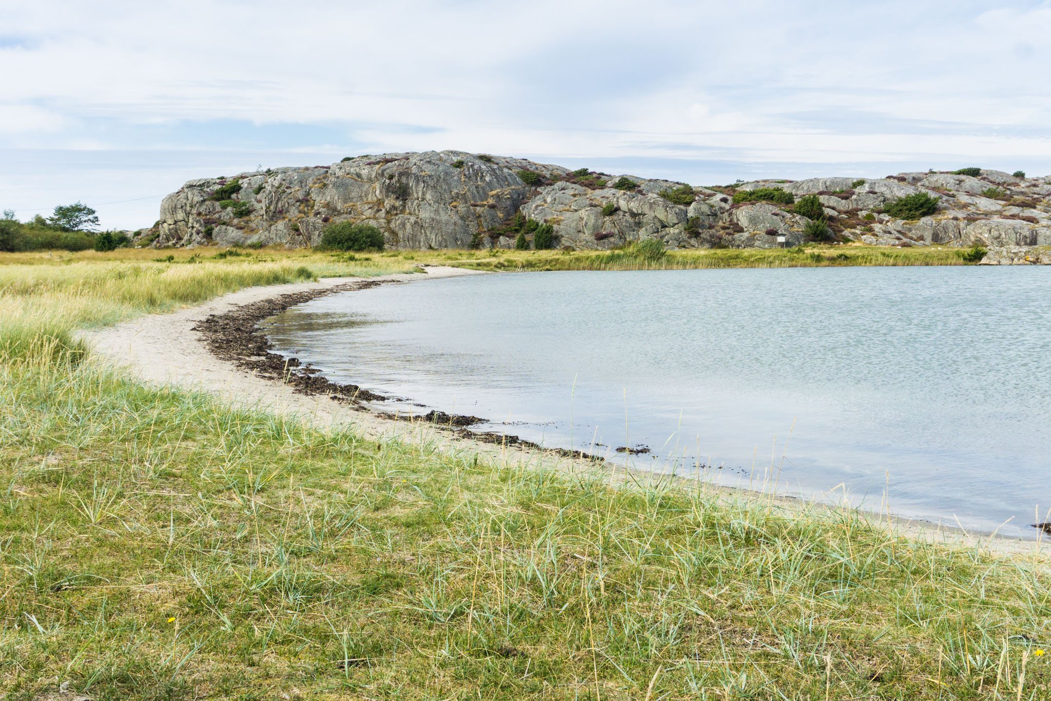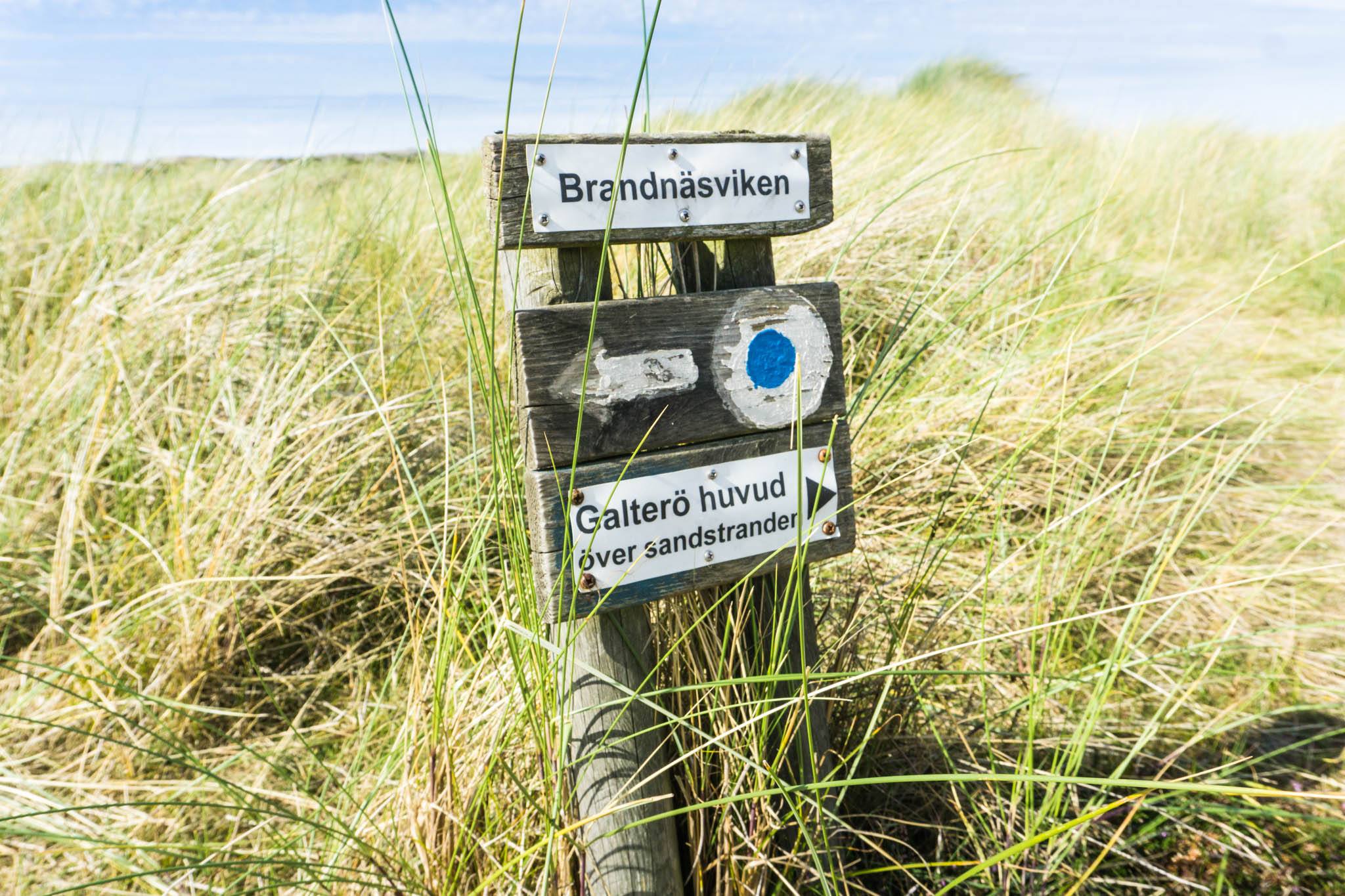 Der weiß-blau markierte Weg biegt nun nach links ab, es gibt aber einen weiteren Weg, der über den Strand und um die Lagune herum führt: „Galterö huvud – över sandstranden“. Den nehmen wir.