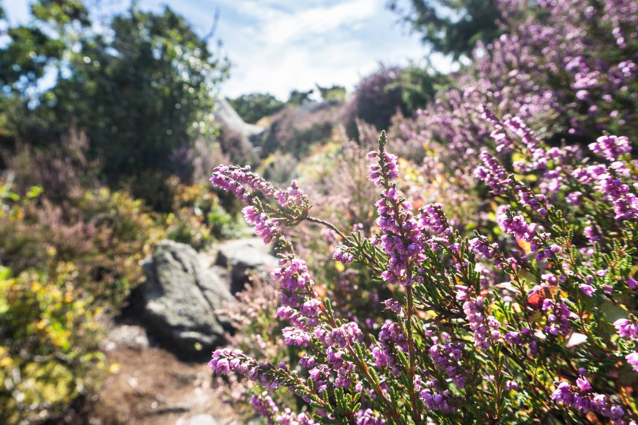 Dieser Weg lohnt sich sehr, denn er ist im Vergleich zur bisherigen Wanderung durchaus etwas wilder. Einen sichtbaren Weg gibt es hier zunächst nicht. Große, flache Felsen liegen zwischen Erikafeldern. Wir müssen wieder auf die weiß-blauen Punkte achten, um den richtigen Weg zu finden.