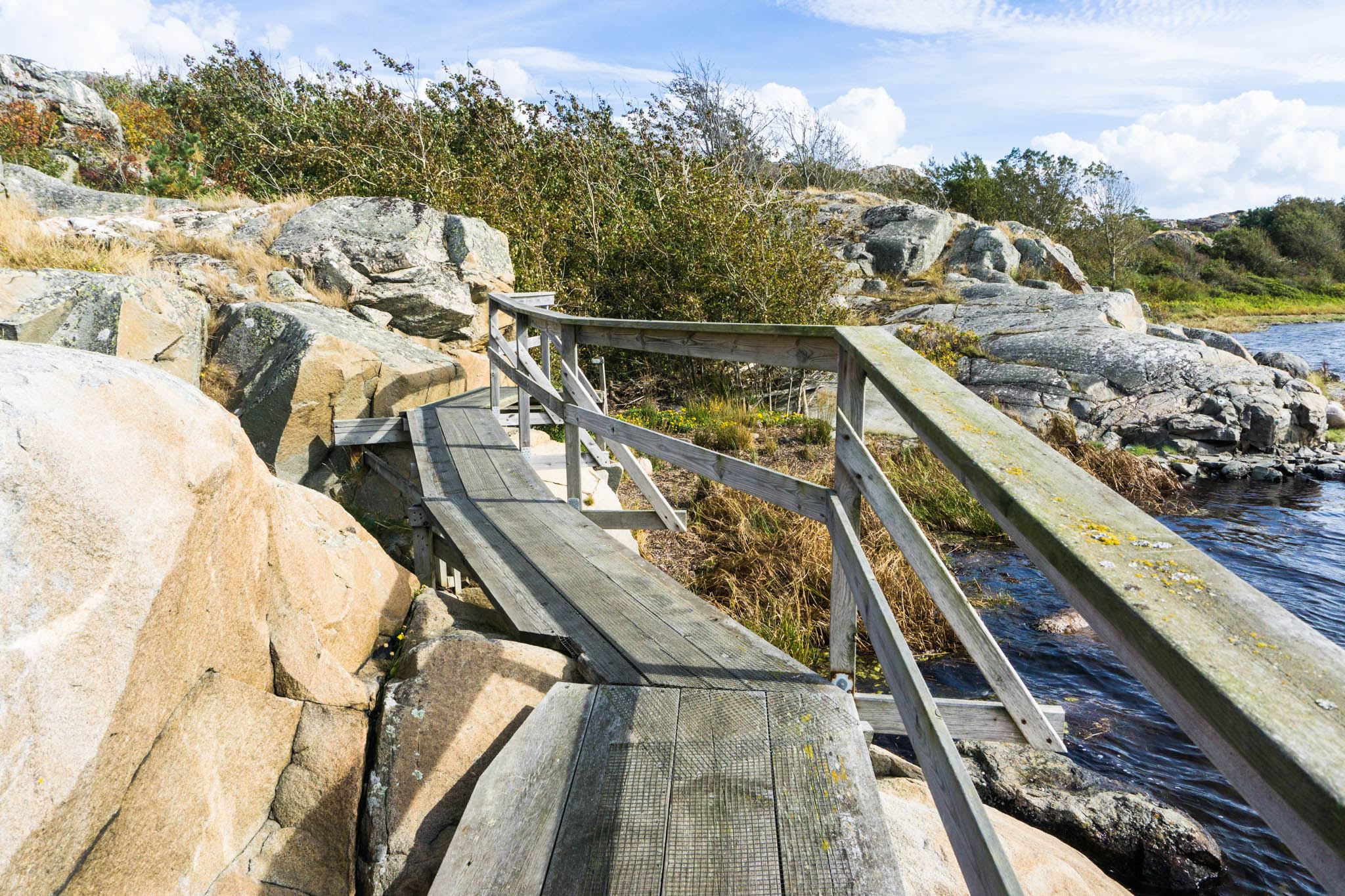 Der Weg führt nun zunächst über eine Wiese, dann wird er richtig schön: Über Stege, Holztreppen und manchmal auch direkt über den Fels ist der Weg direkt am Ufer angelegt. Immer mit Blick auf den kleinen Hafen mit seinen rot gestrichenen Holzhäuschen.