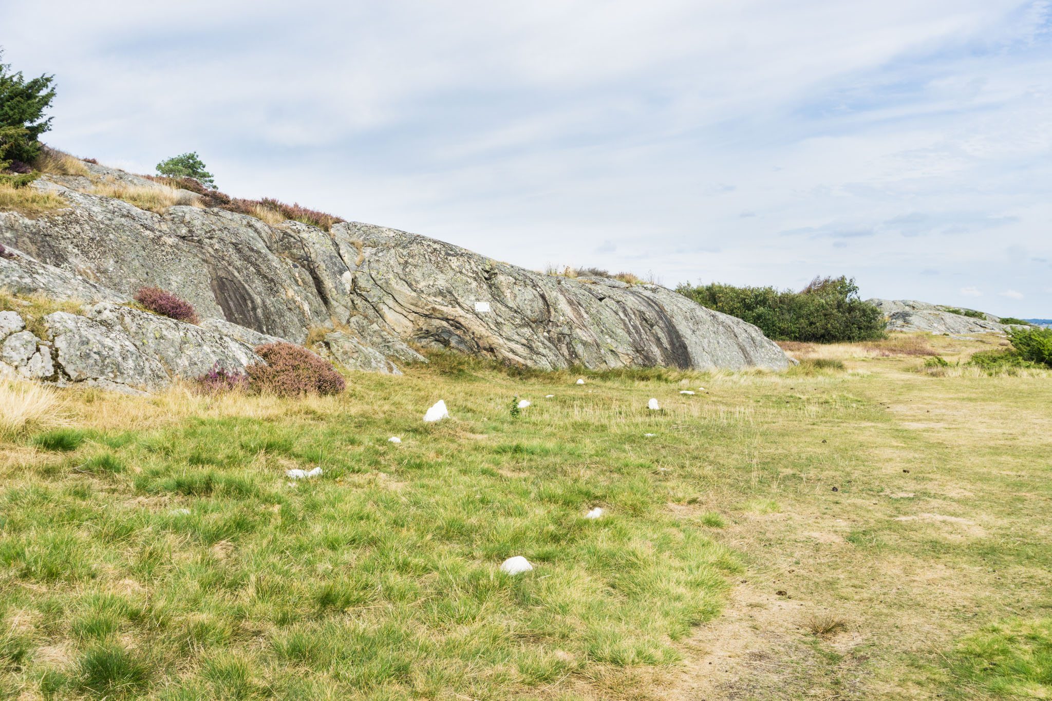 Am gegenüber liegenden Ende der Bucht liegen einige weiße Steine in zwei Reihen angeordnet im Gras. An einem Felsen ist eine Tafel mit einer schwedische Inschrift montiert.