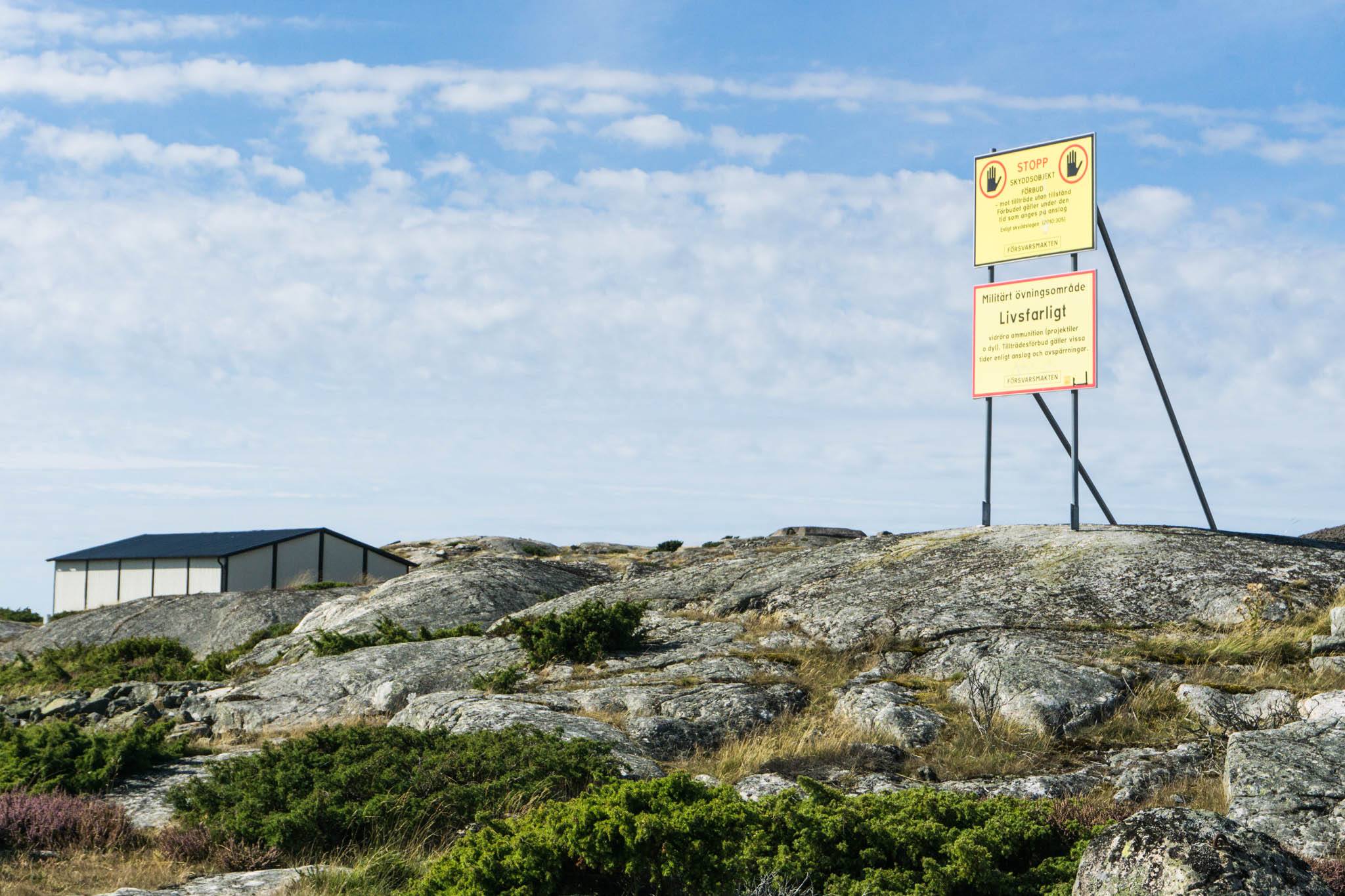 Ein Haus, eher eine Lagerhalle, und zwei große, rot umrandete gelbe Schilder zeigen den militärischen Teil von Galterö an. Hier soll man nicht weitergehen, da man auf Munitionsreste stoßen könnte.