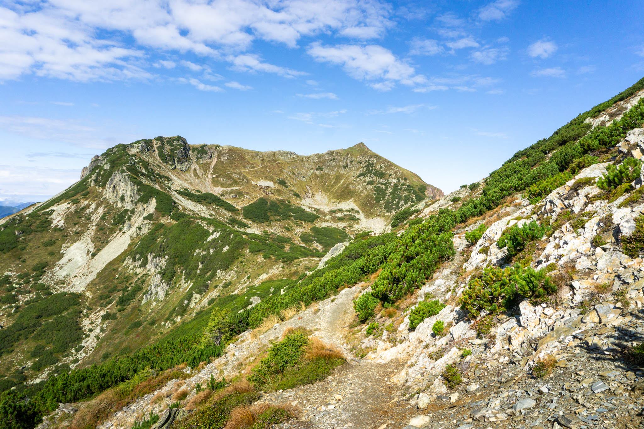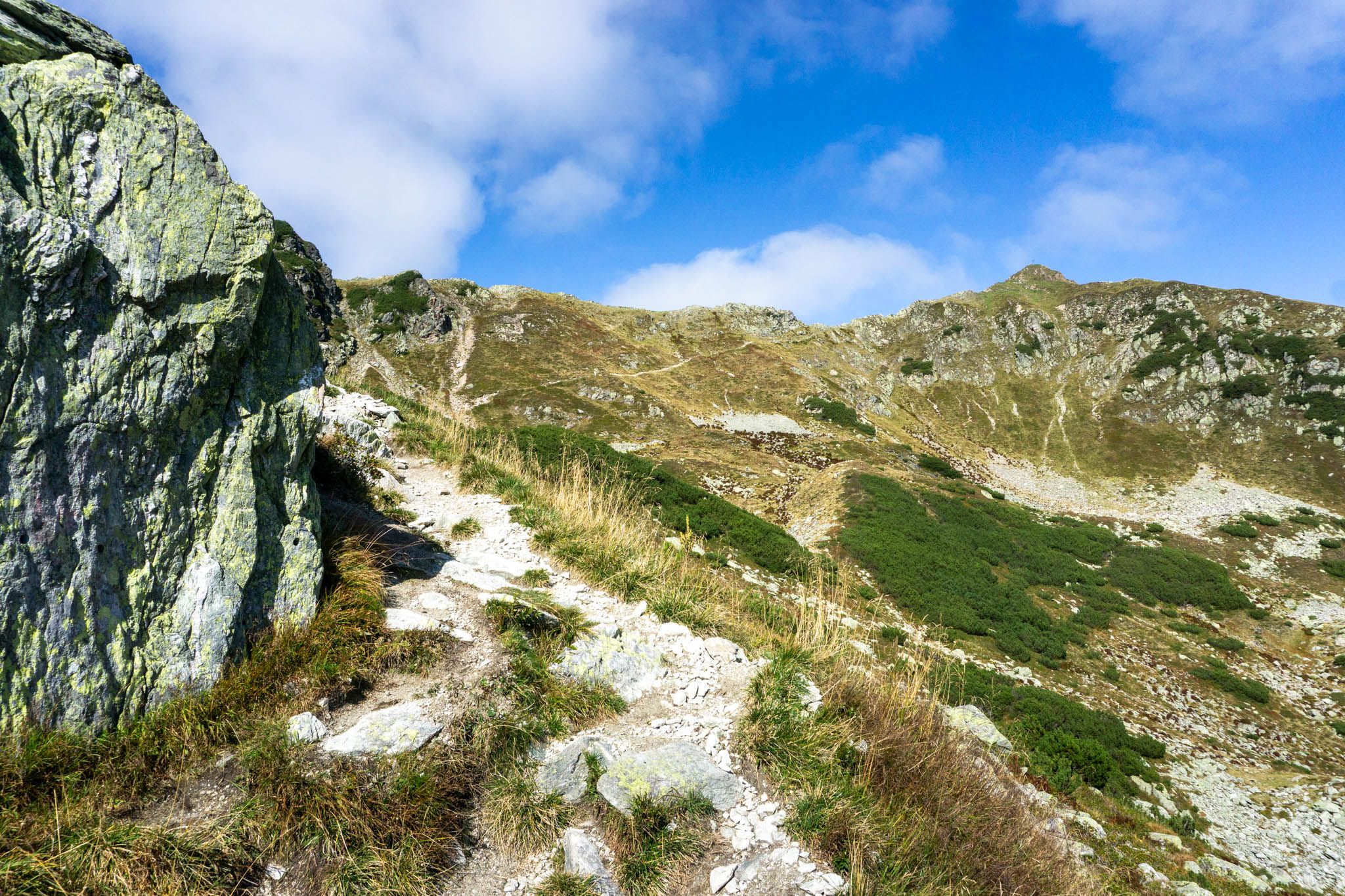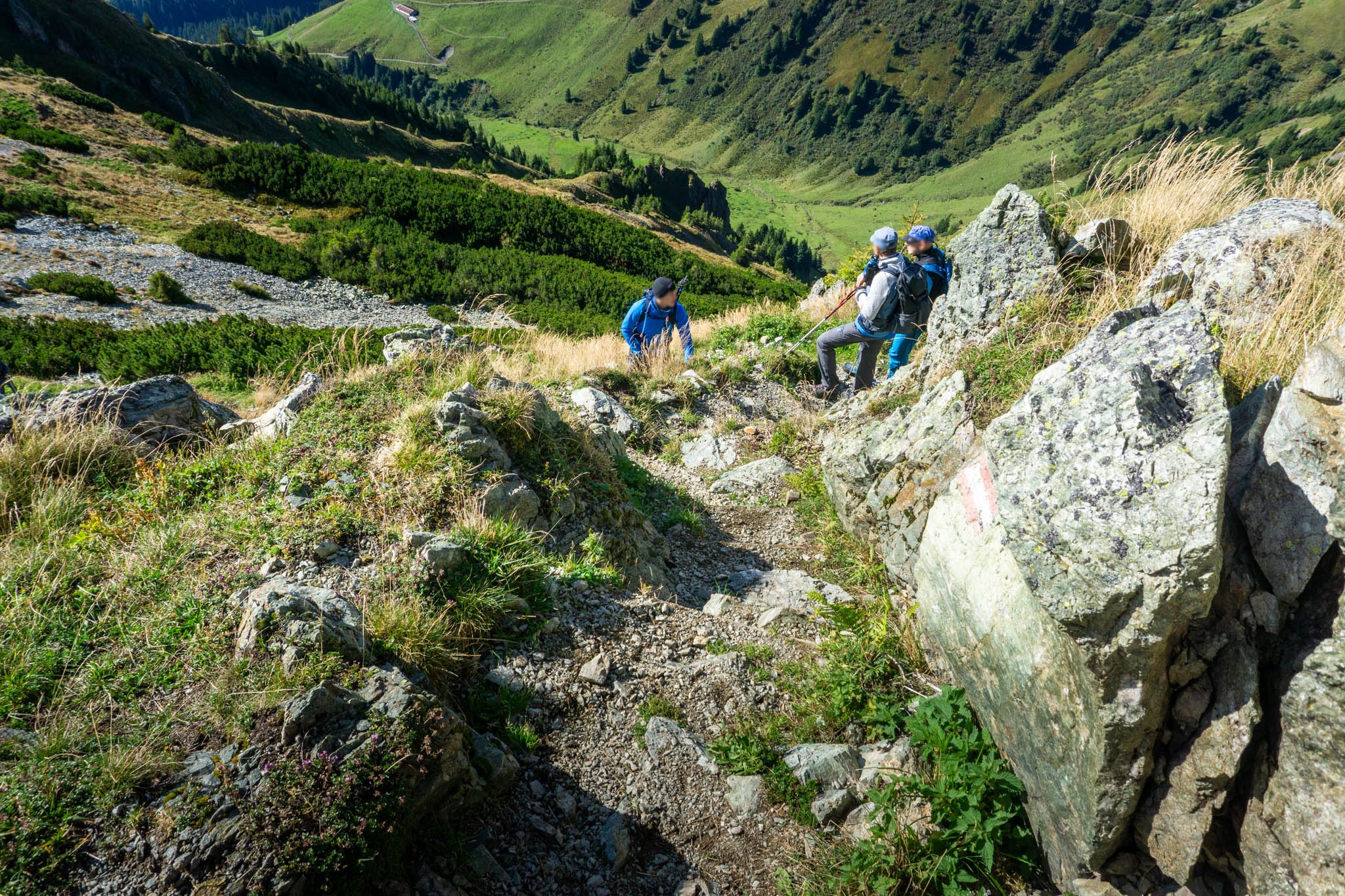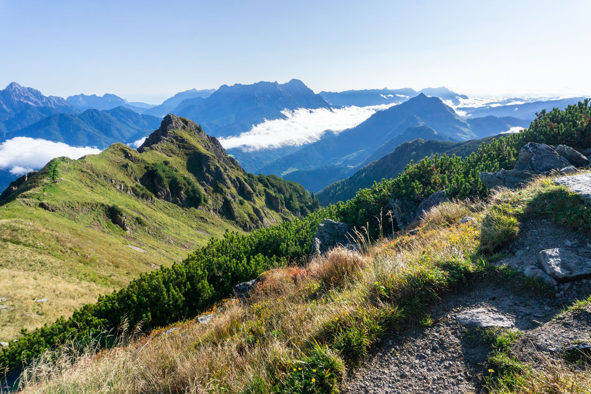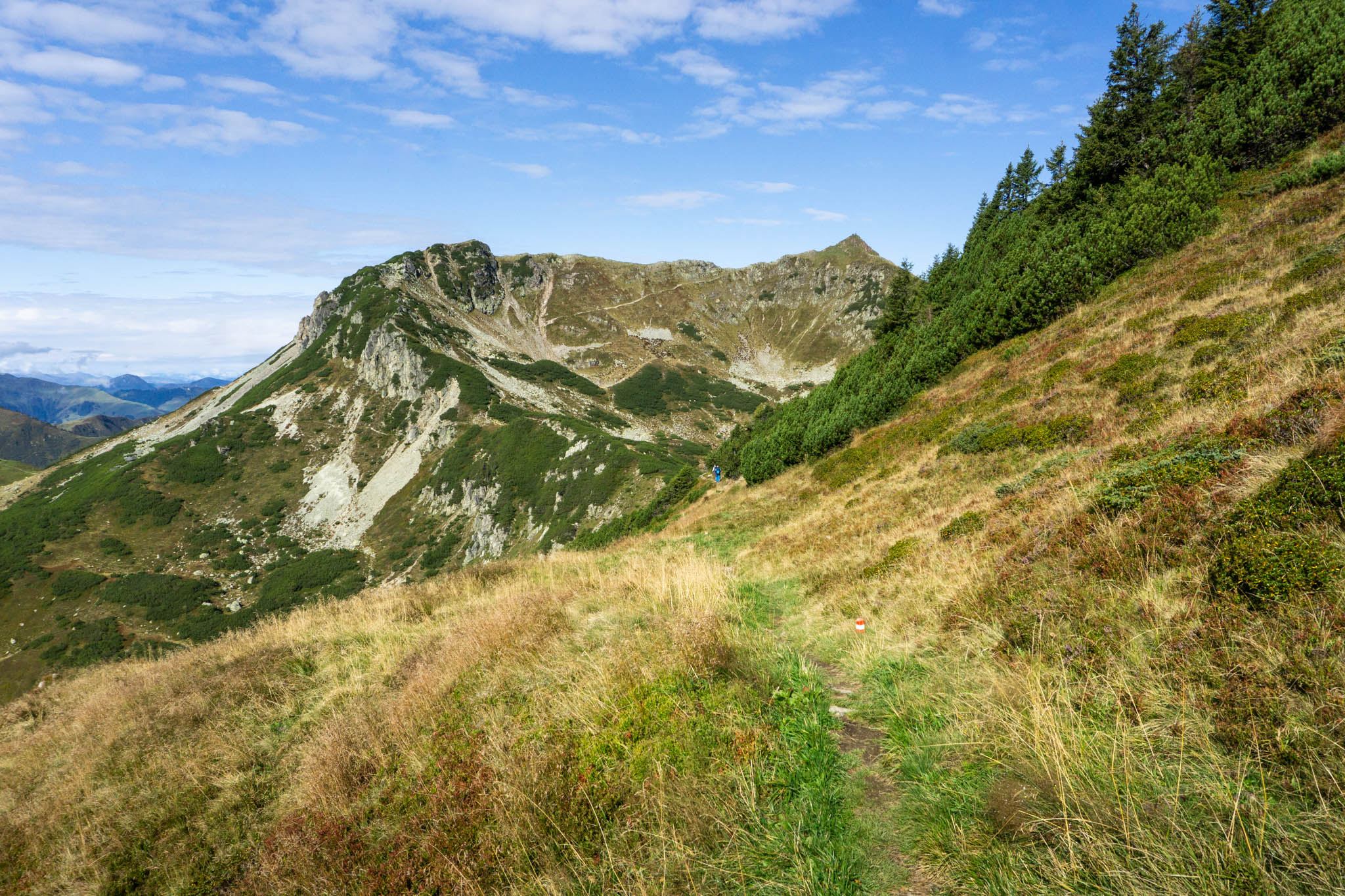 Der Weg führt nun nur noch kurz zwischen den Latschen hindurch, dann durch sehr fesiges Gelände, teilweise geht es über kleinere Felsen. Danach zieht sich der Weg den grasigen Hang hinauf in Richtung Wildseeloder-Gipfel.