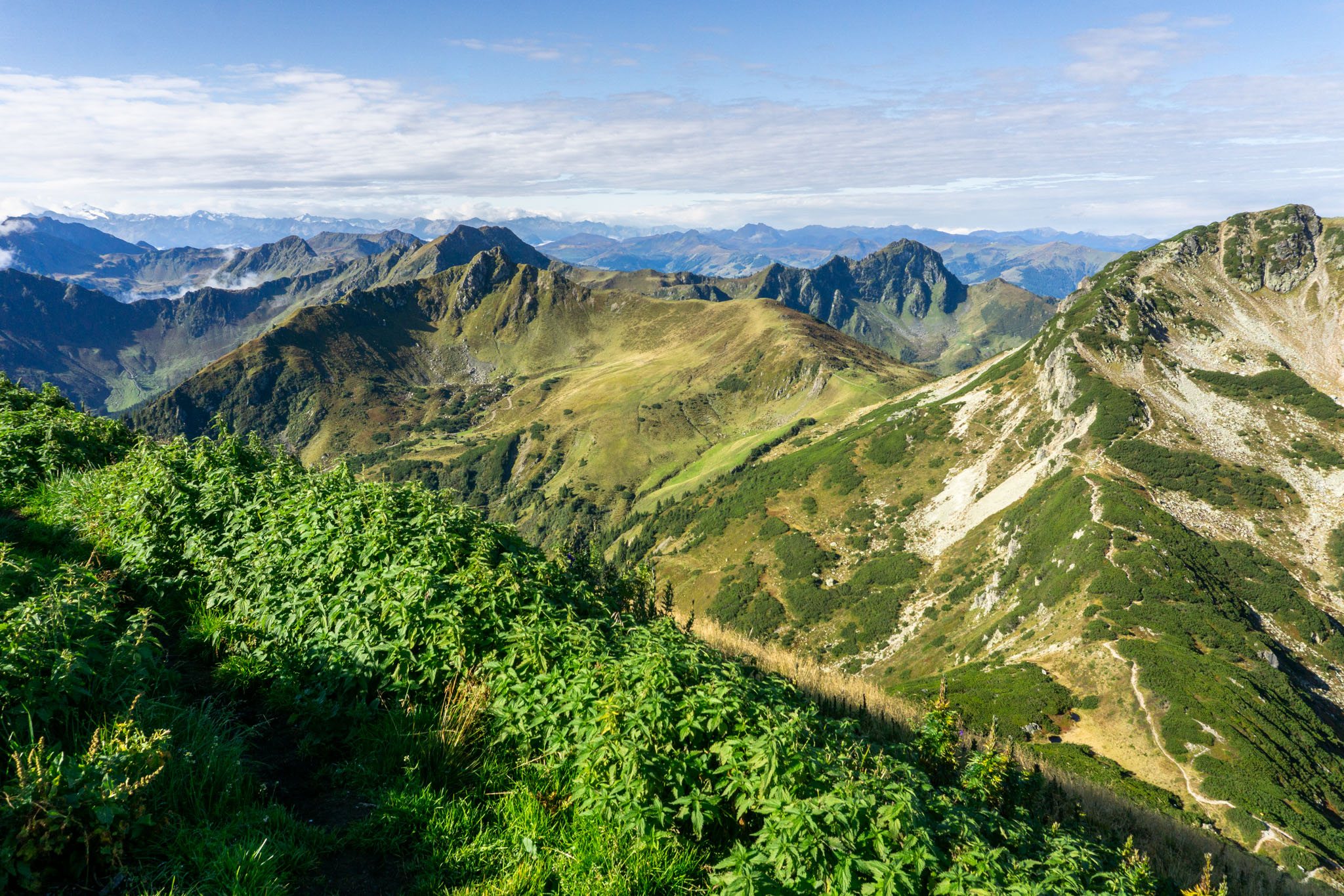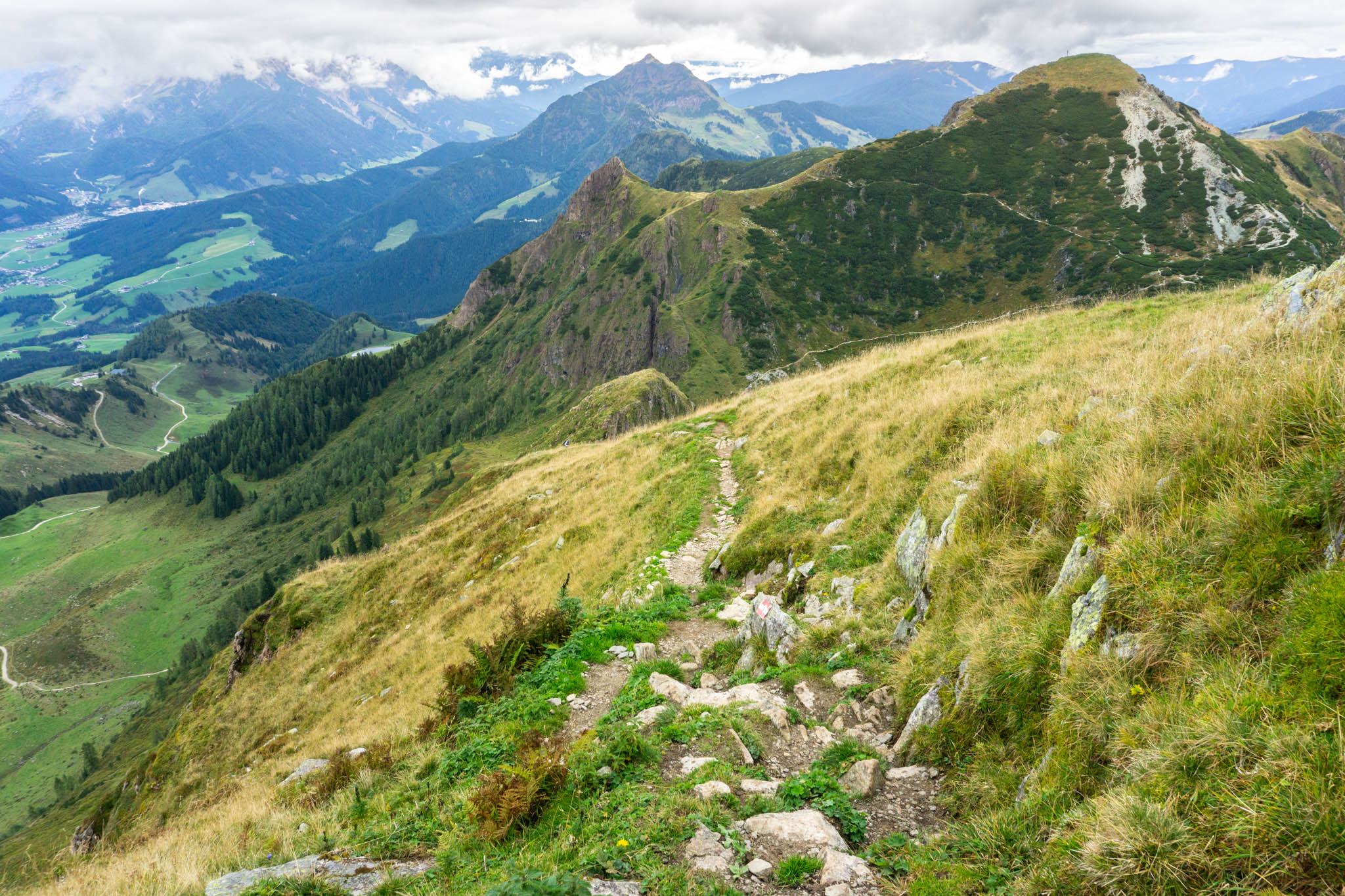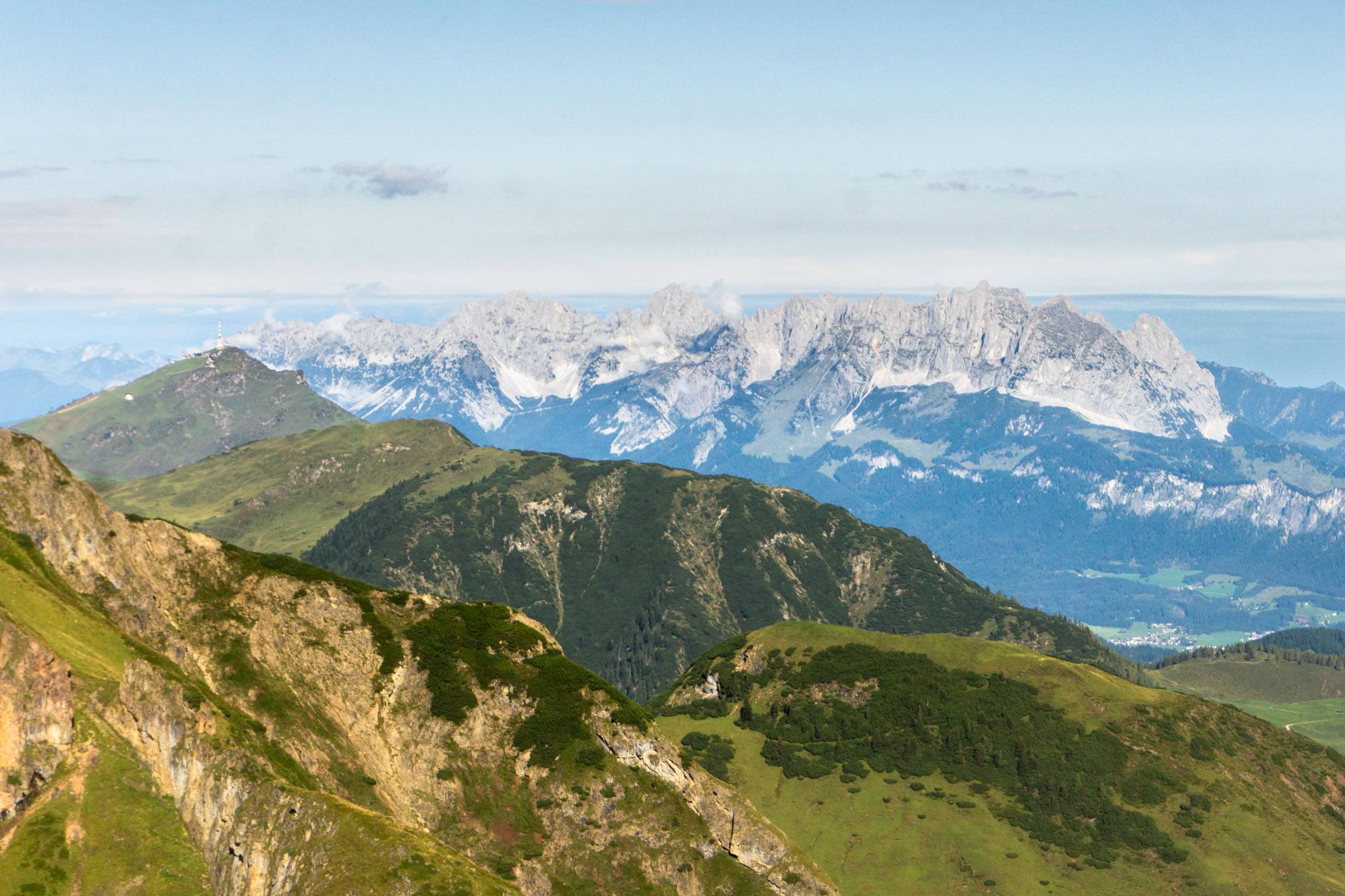 Nach Süden hin sehen wir eine grüne Alpenlandschaft mit unzähligen Gipfeln am Horizont. Im Nordwesten können wir den großen Sendemast auf dem Kitzbüheler Horn erkennen.