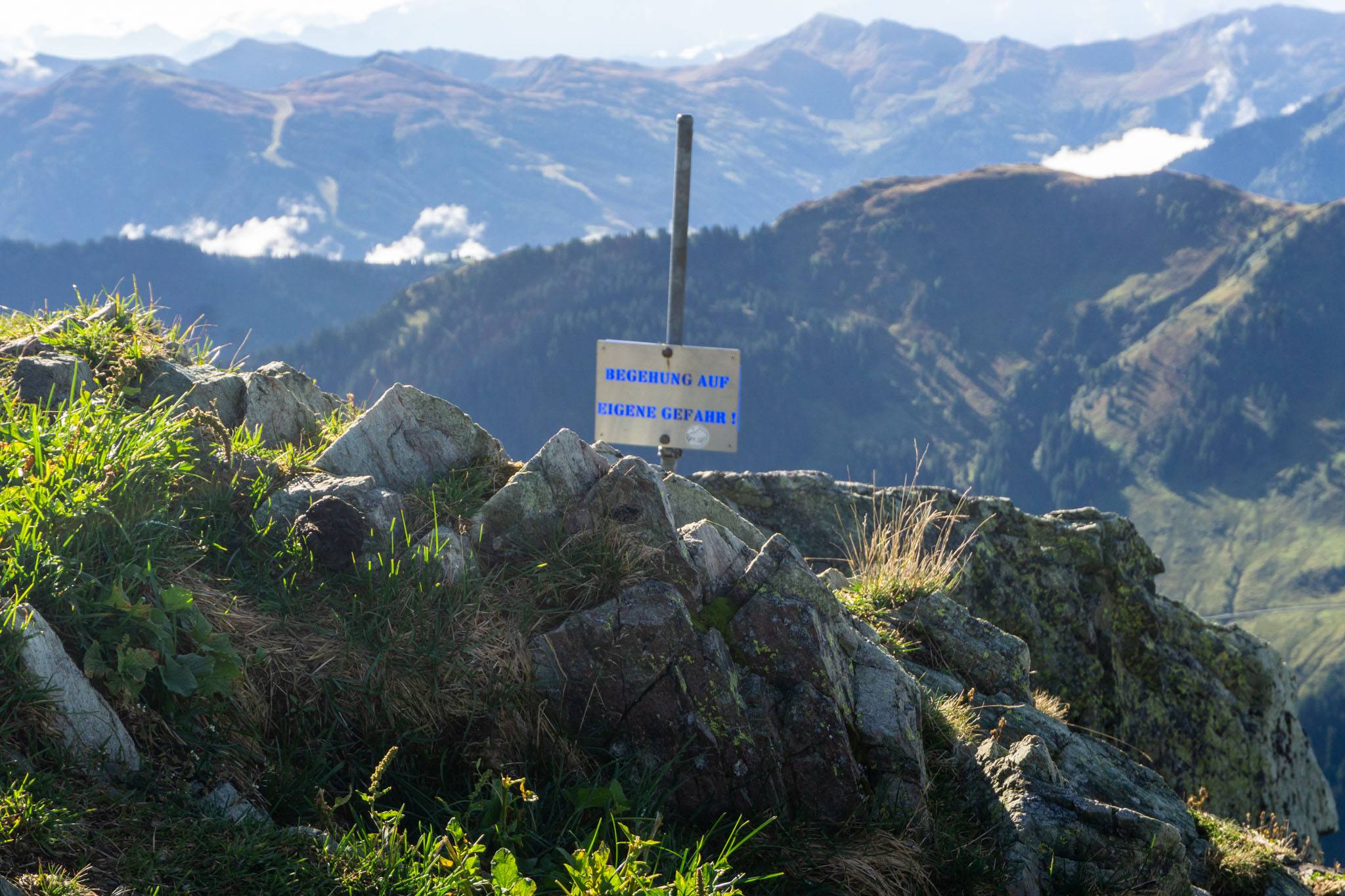 Wir müssen uns entscheiden, ob wir auf dem Aufstiegsweg wieder absteigen oder die Henne überschreiten. Der weitere Weg ist auf der Karte nur noch gepunktet eingezeichnet und ein Schild „Begehung auf eigene Gefahr!“ wirkt nicht gerade vertrauensbildend. Auch der erste Blick hinab sieht bedrohlich aus.