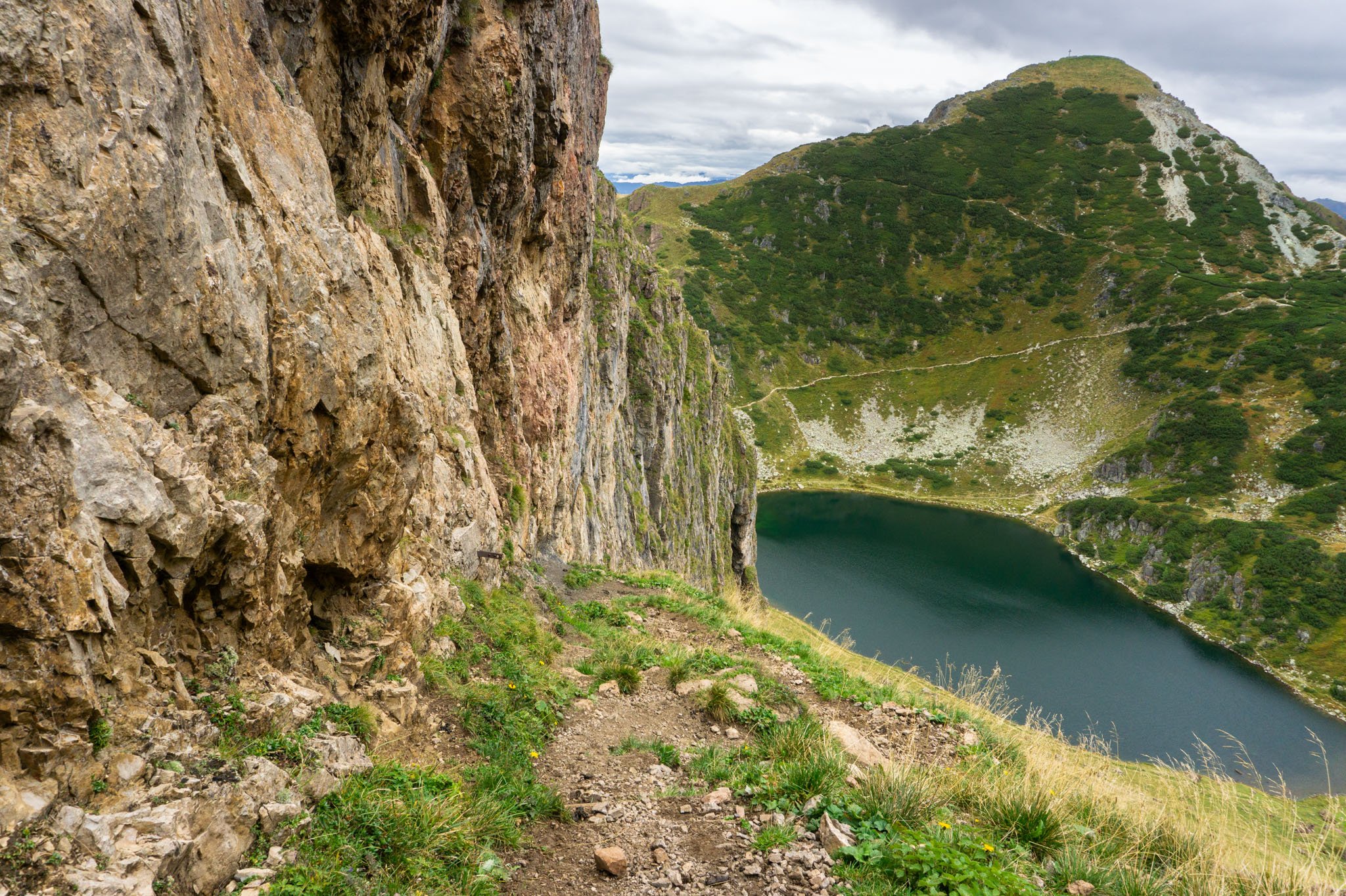 Dann führt der Weg zwischen zwei Felswänden hindurch direkt auf den See zu. In einigen Serpentinen gehen wir bergab und kommen dem See schnell näher. Direkt unterhalb der Felswand erreichen wir das Seeufer und damit auch wenige Meter weiter die Wildseeloderhütte.