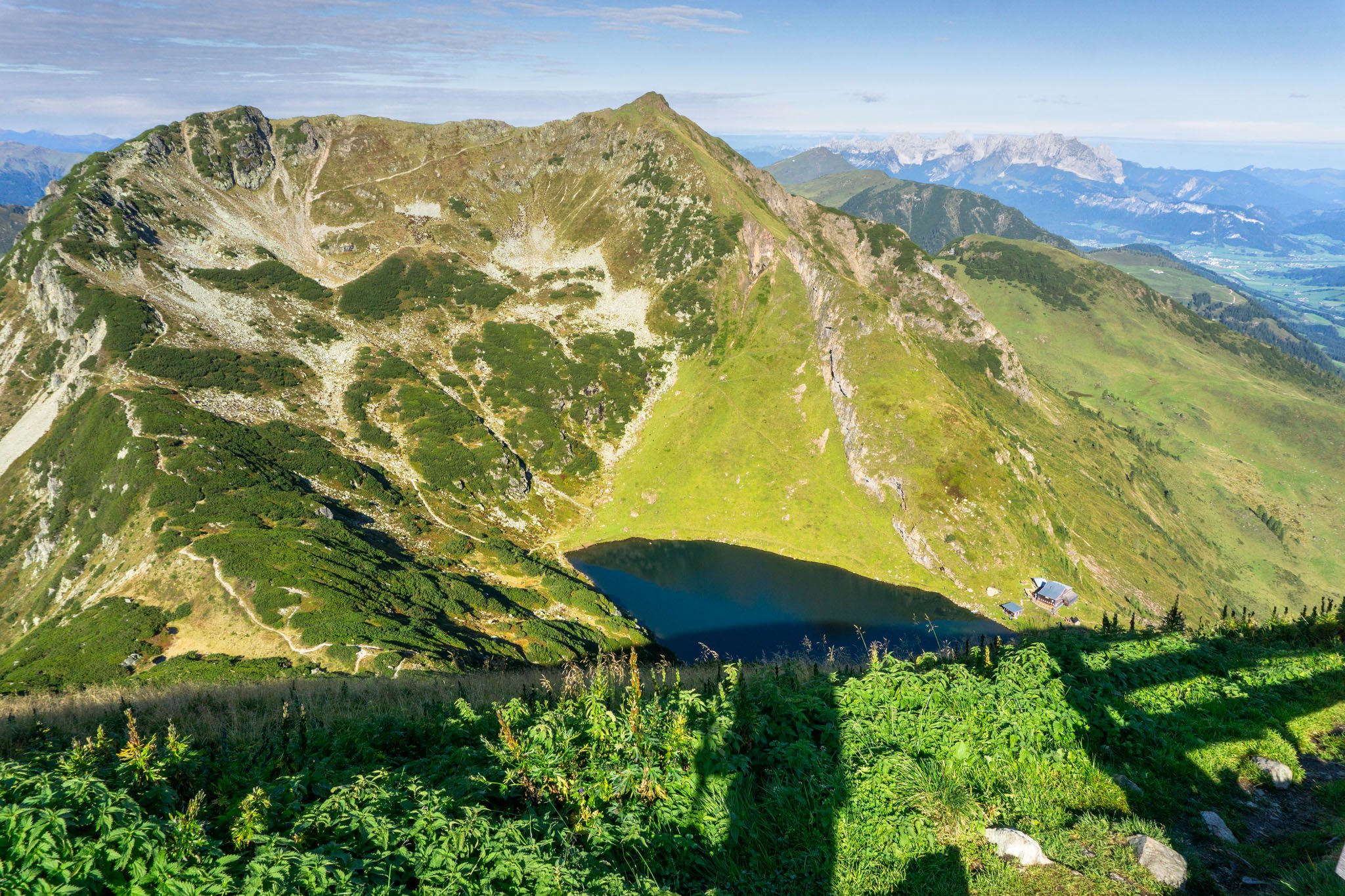 Auf 1854 Metern Höhe liegt das Wildseeloderhaus direkt am Wildsee, der von den Berghängen der Henne (2078 Meter) und des Wildseeloders (2118 Meter) umgeben ist. Zwischen beiden liegt der Sattel Seenieder auf 1933 Metern Höhe. Nur direkt neben dem Haus ist der Ring unterbrochen, hier befinden sich der Abfluss des Wildsees und daneben der Aufstiegsweg. Dort haben wir einen direkten Blick auf die Loferer Steinberge.