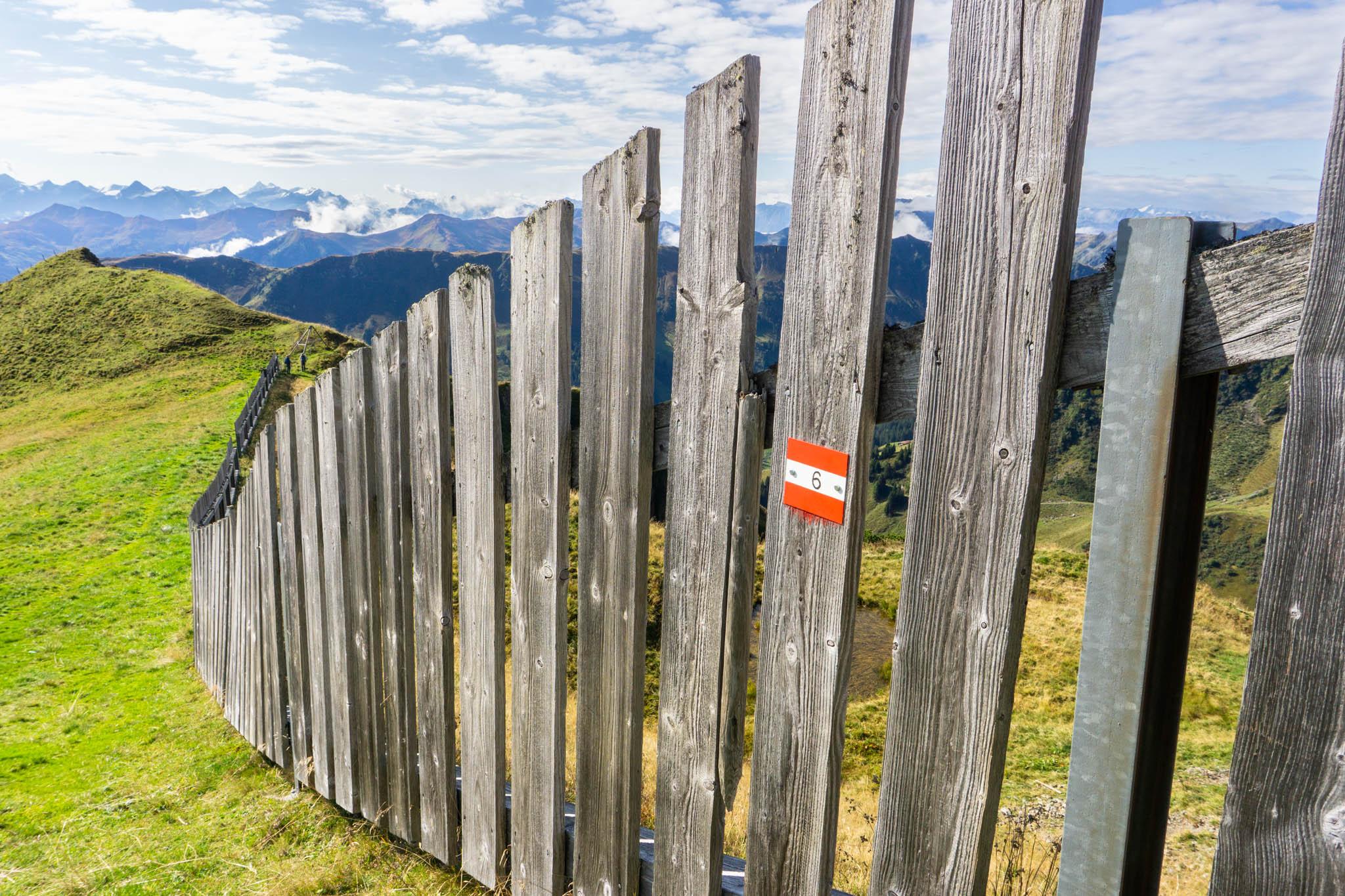 Auf der Wiese an der Bergstation angekommen gehen wir an Holzzaun entlang, wechseln am Ende auf die andere Seite und folgen dem Weg, der wieder zum Wildseekessel führt. Wieder am Hang entlang, wieder auf schmalem Pfad und wieder gut zu gehen.