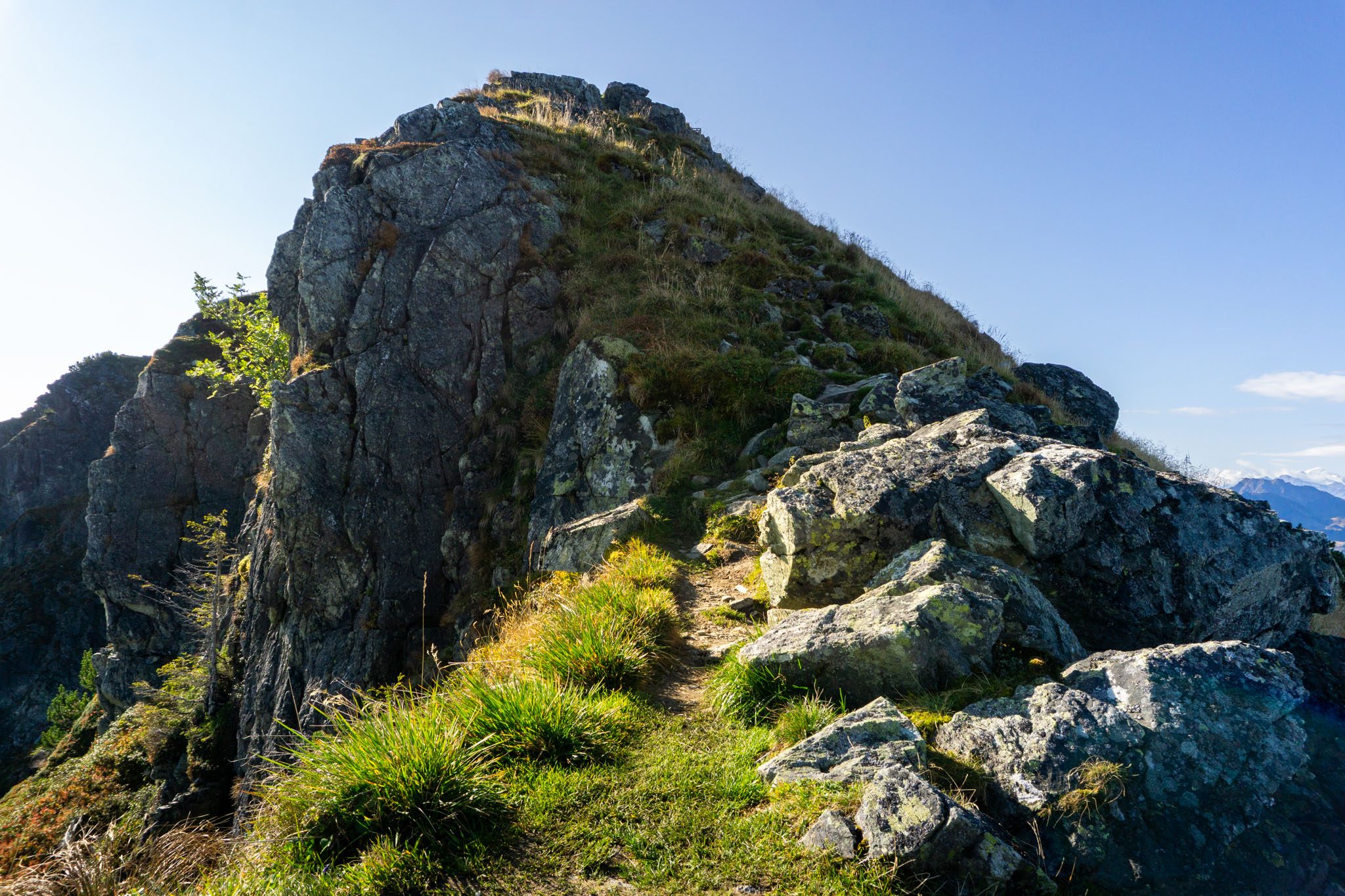 Etwas unterhalb des Gipfels wechselt der Weg auf die linke Seite eines Felsriegels, dann geht es weiter bergauf. Den unmittelbaren Gipfel, ungefähr die letzten zehn oder fünfzehn Meter, habe ich mir dann geschenkt. In den Minuten zuvor hat es deutlich zugezogen und wir wollten vor dem Regen wieder am Haus sein.