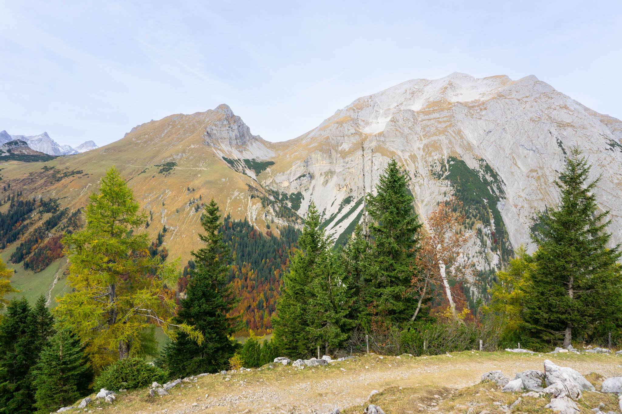 Doch kurz bevor wir an der Drijaggenalm den höchsten Punkt der Wanderung erreicht haben, öffnet sich das Panorama. Ein Blick auf die gewaltigen Lalidererwände, die Spritzkarspitze, das Gamsjoch-Massiv und das Hohljoch sind einfach grandios.