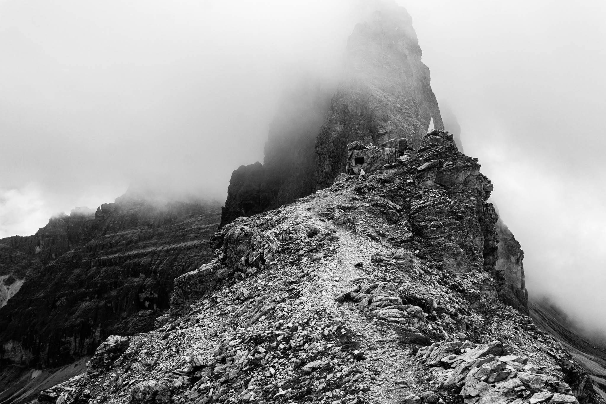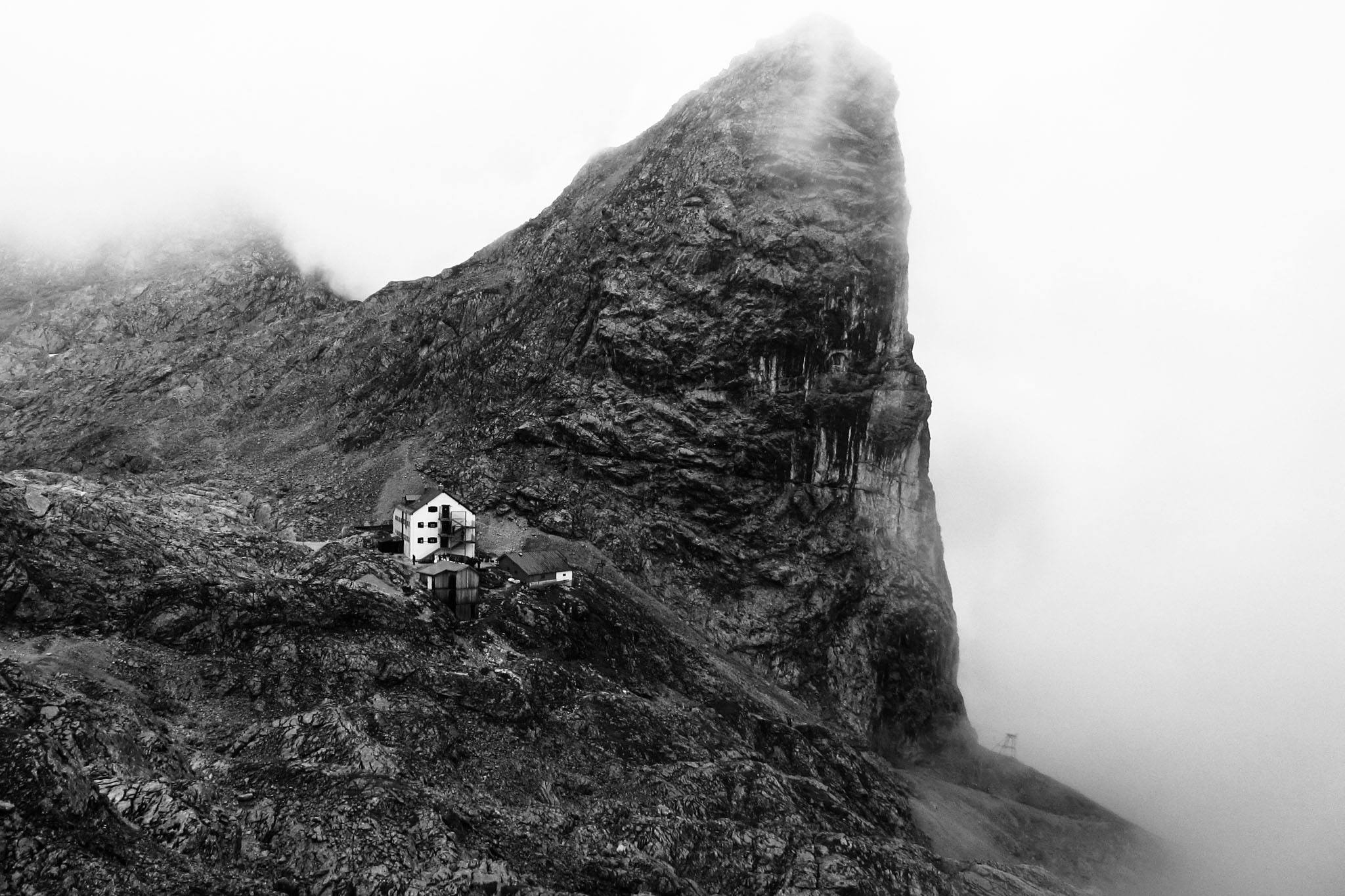 Am Blaueisgletscher hingen die Wolken nur über dem Gletscher, als wollten sie die letzten Eisflächen vor der Sonne schützen. Beim Ingolstädter Haus im Steinernen Meer waren es dann die Felsstrukturen, wegen denen ich von dem Bild eine schwarzweiße Version erstellt habe. Ähnlich ist es beim Riemannhaus, wobei hier noch der steil aufragende Sommerstein die Dimensionen verdeutlicht.